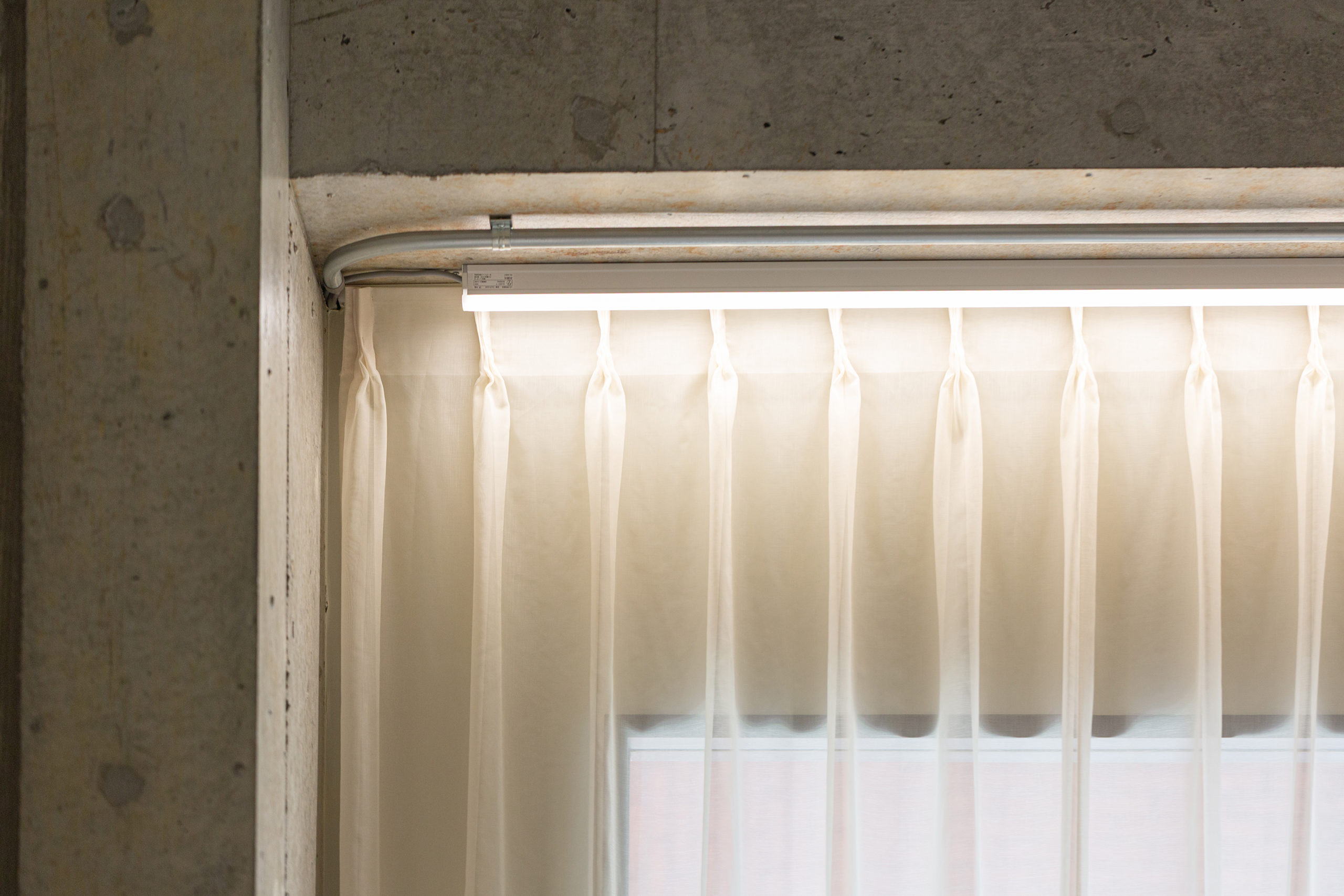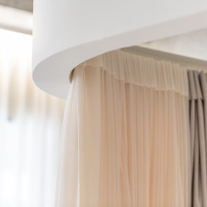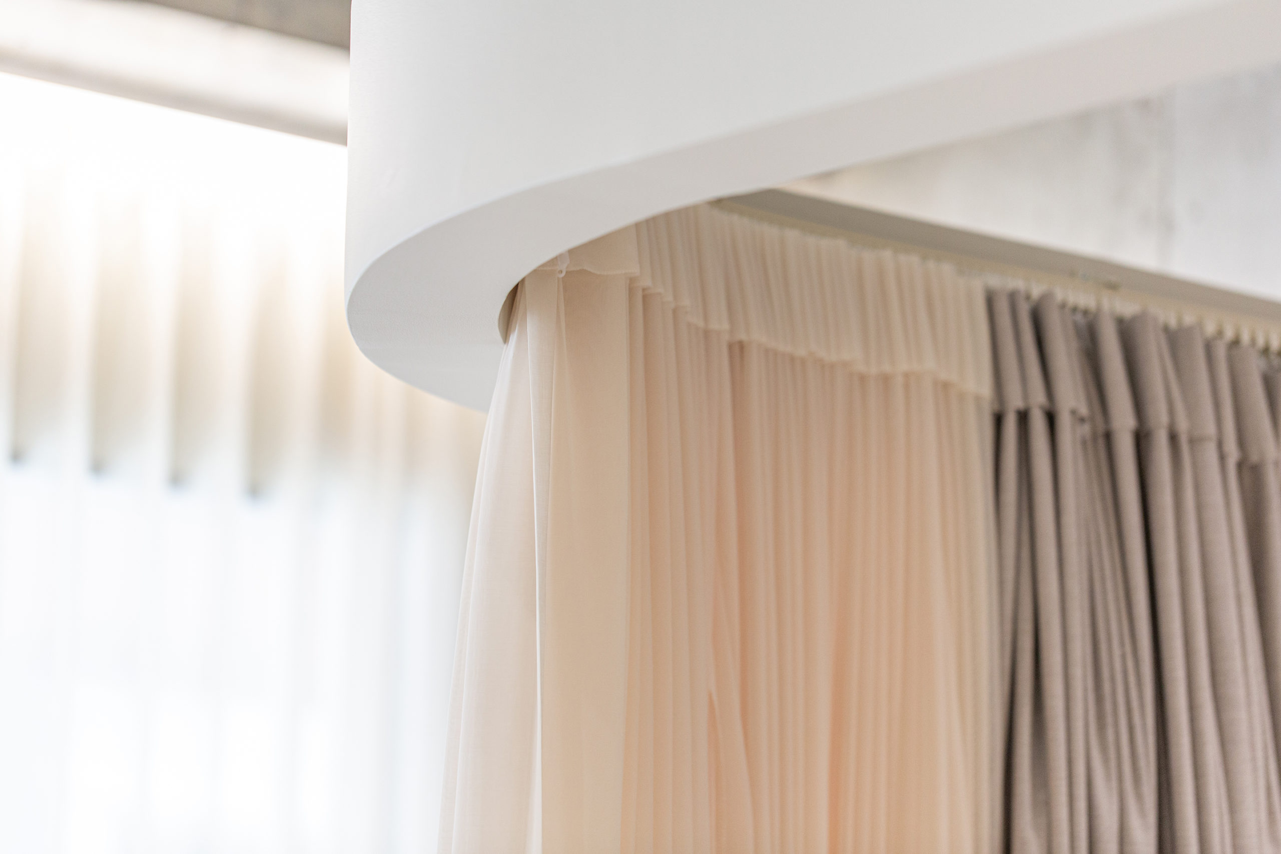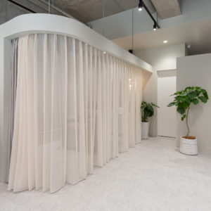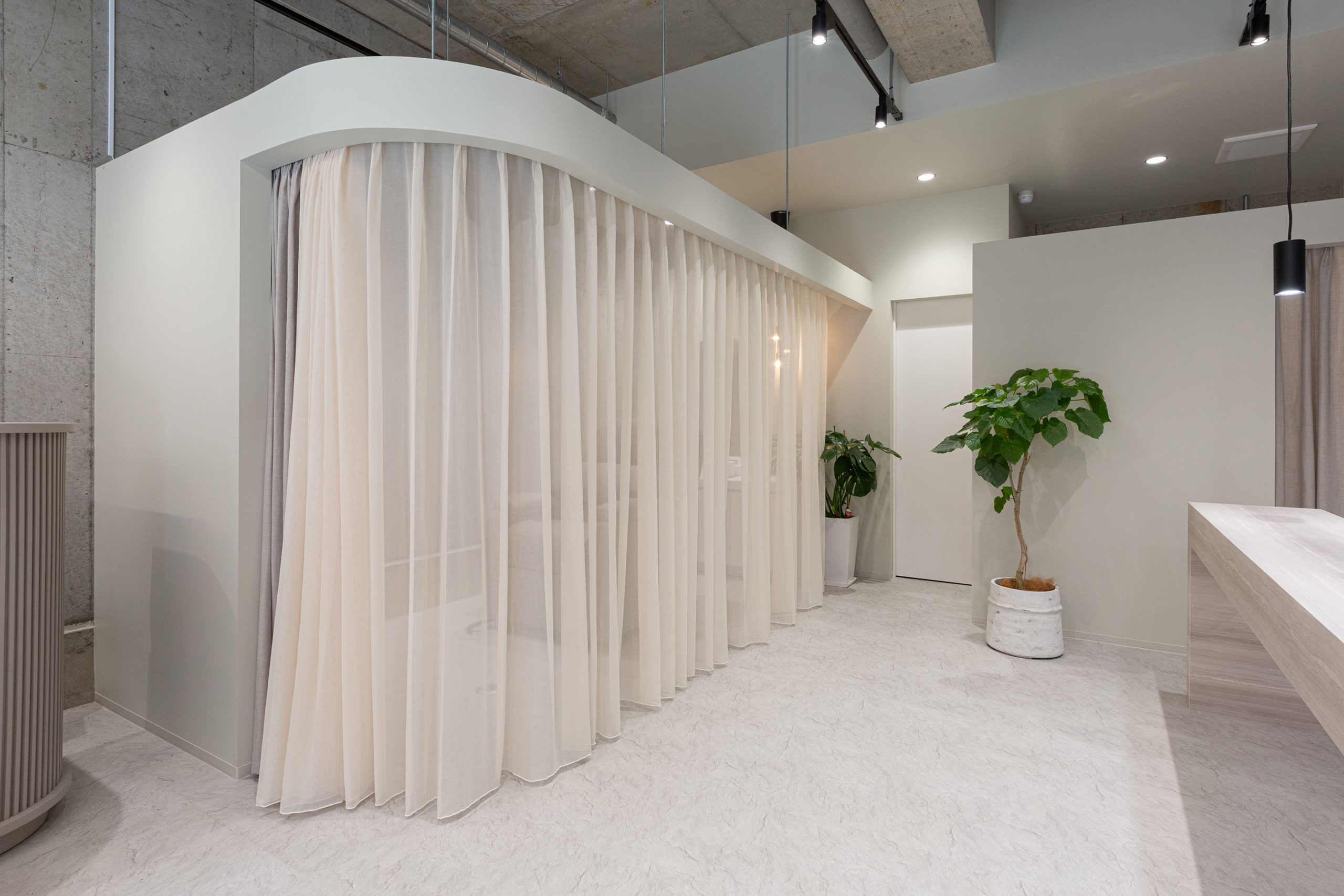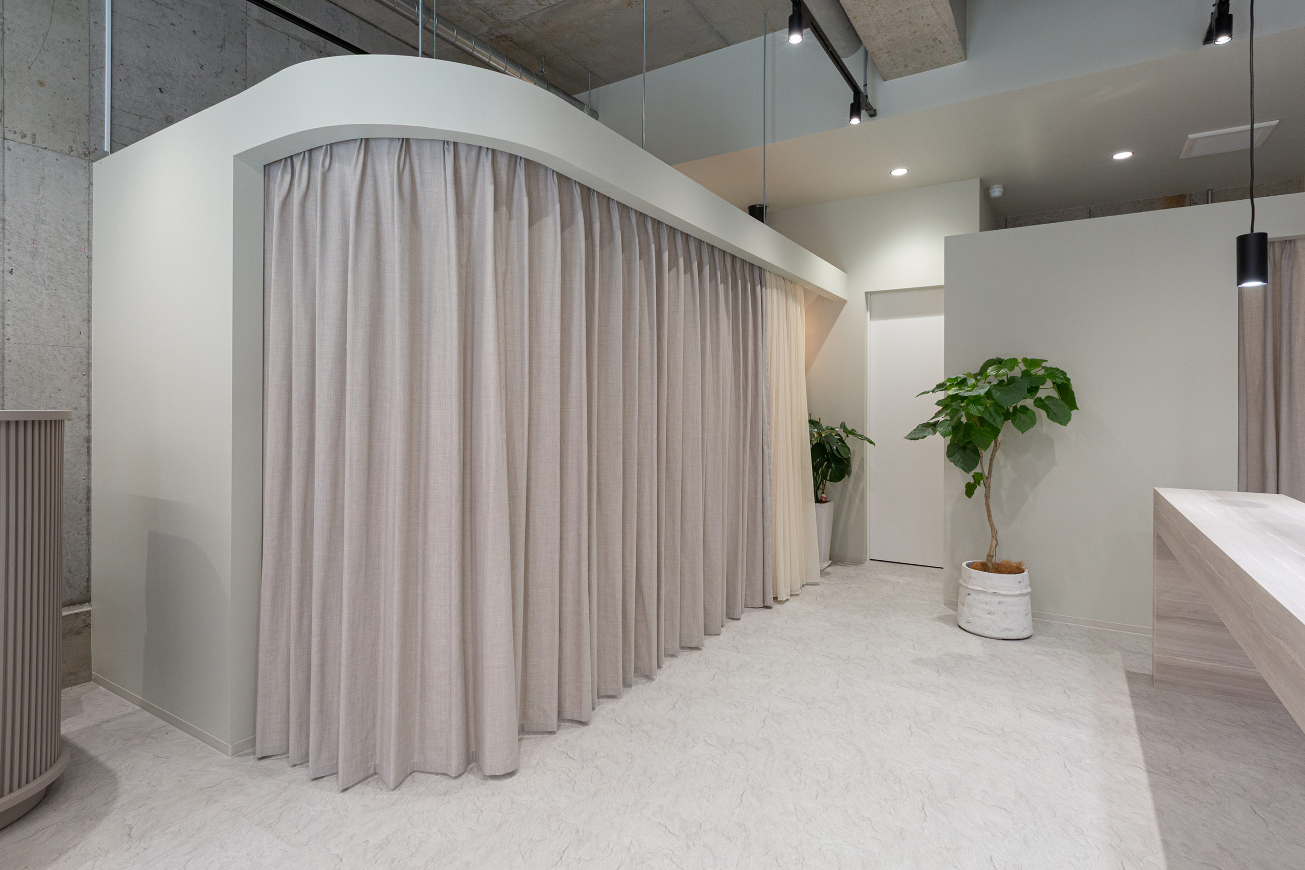 また、壁面や什器に取り入れた曲線のデザインに加え、柔らかな質感のファブリック素材や間接照明を組み合わせることで、やさしく包み込むような空気感を演出しています。