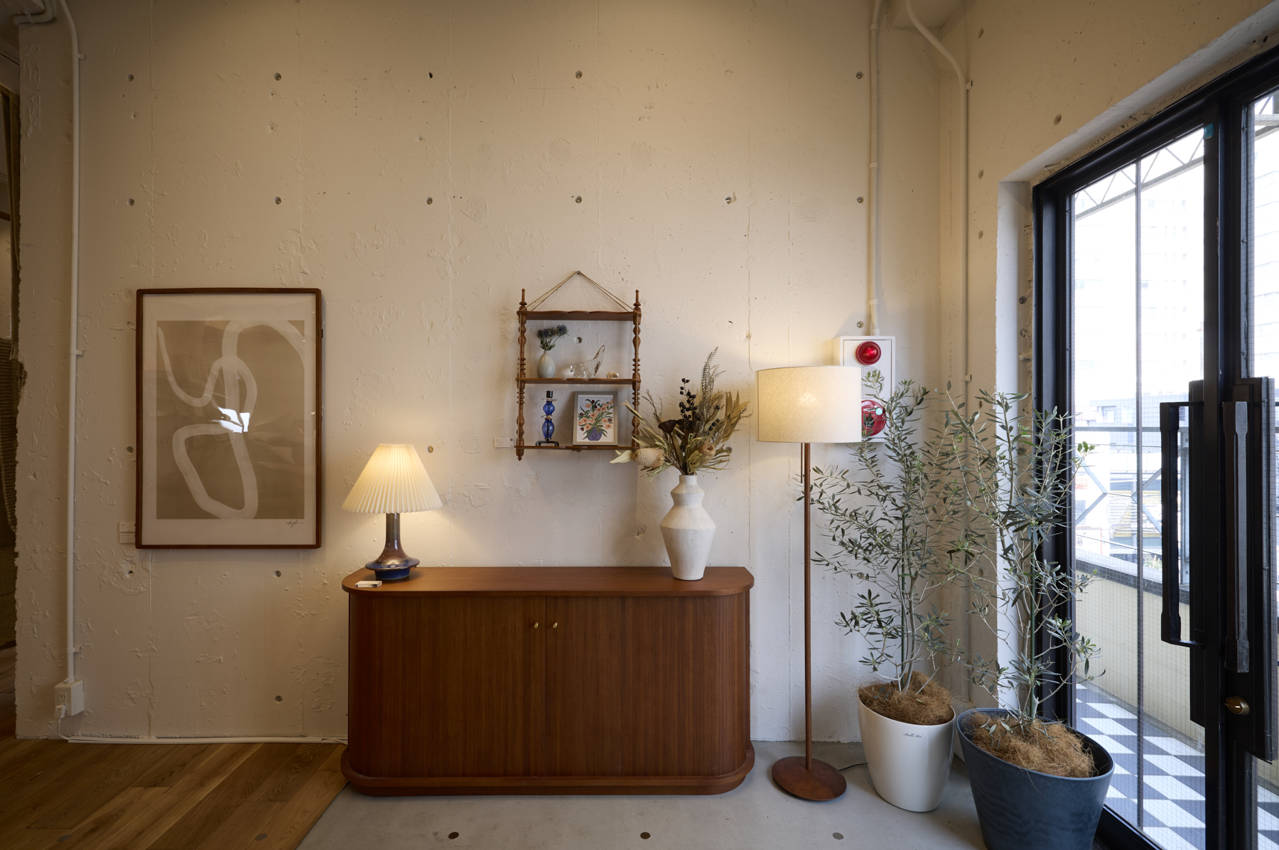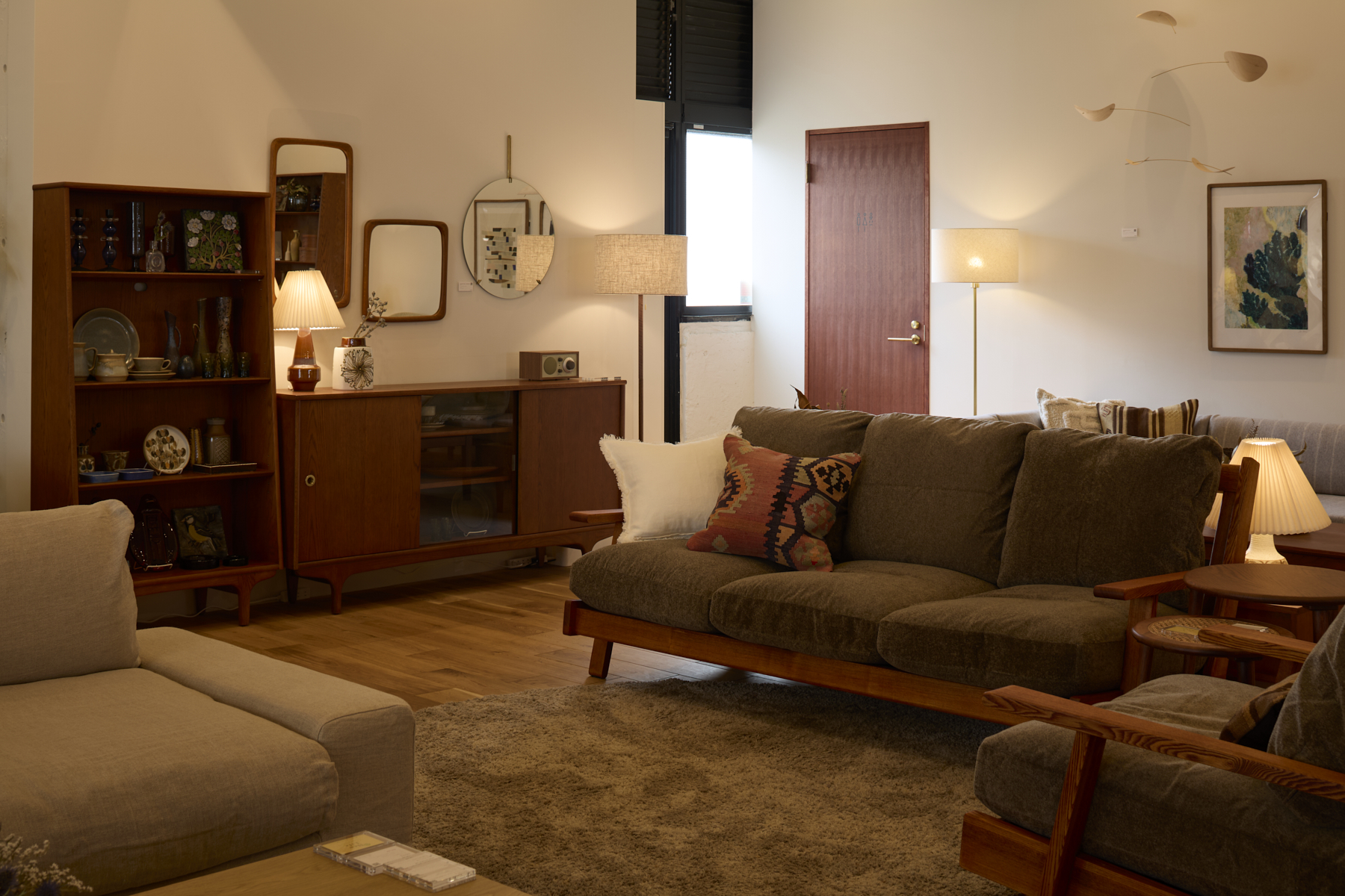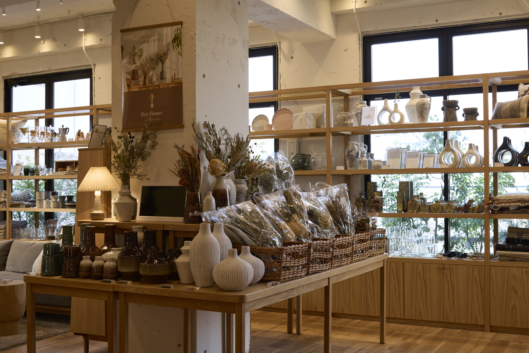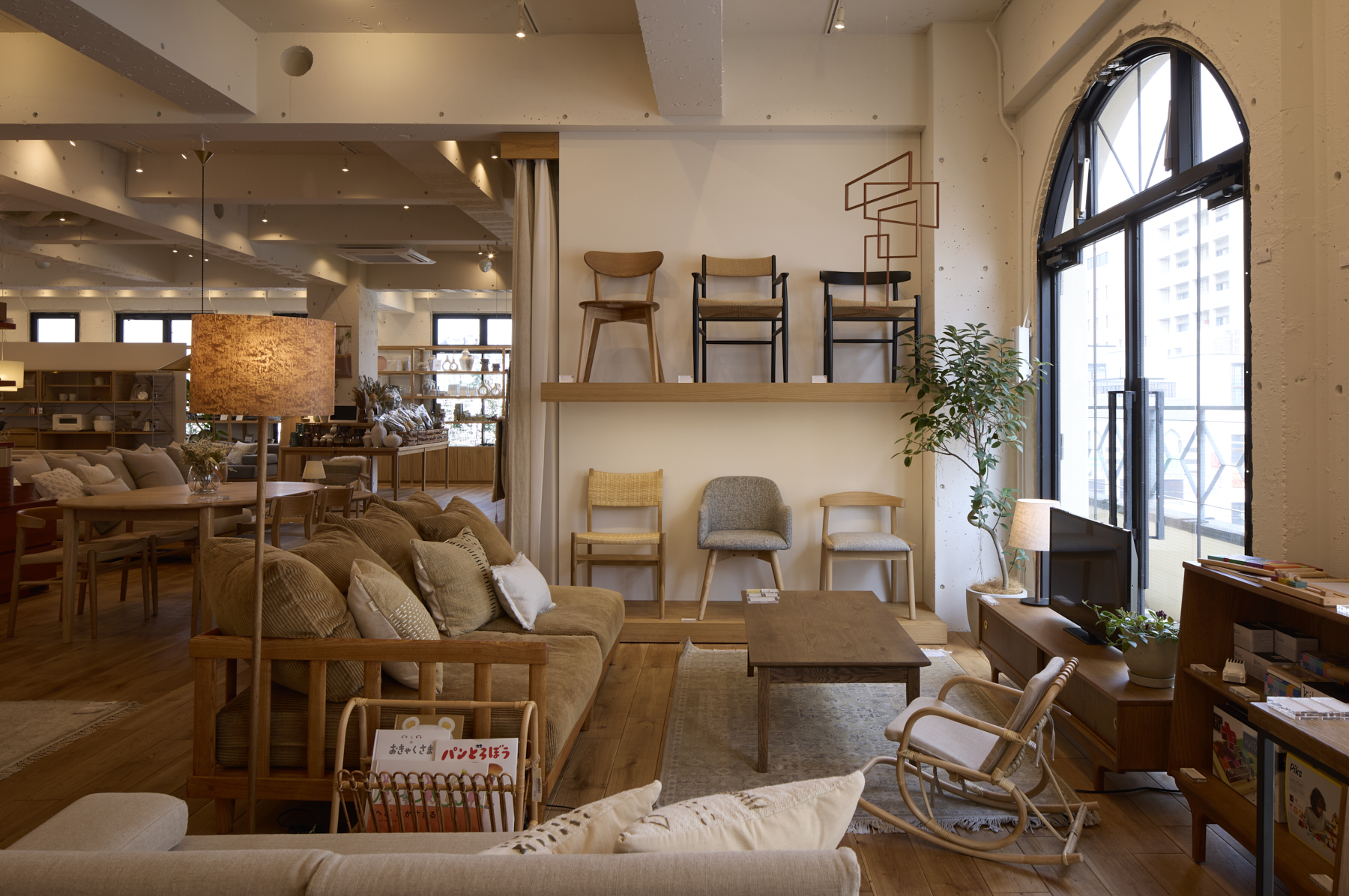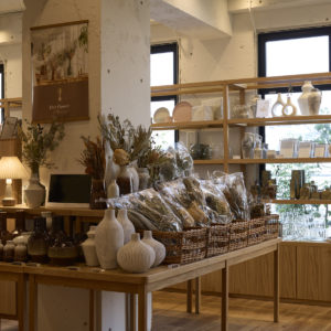 店内には、素材の温もりと手仕事のぬくもりを感じる家具が並び、窓の外には芝を敷き詰めたテラスが広がります。